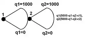 The tree on the left represents such a game, either with infinite action spaces (any real number between 0 and 5000) or with very large action spaces (perhaps any integer between 0 and 5000). This would be specified elsewhere. Here, it will be supposed that it is the former and, for concreteness, it will be supposed it represents two firms engaged in Stackelberg competition. The payoffs to the firms are represented on the left, with and as the strategy they adopt and and as some constants (here marginal costs to each firm). The subgame perfect Nash equilibria of this game can be found by taking the first partial derivative of each payoff function with respect to the follower's (firm 2) strategy variable () and finding its best response function, . The same process can be done for the leader except that in calculating its profit, it knows that firm 2 will play the above response and so this can be substituted into its maximisation problem. It can then solve for by taking the first derivative, yielding . Feeding this into firm 2's best response function, and is the subgame perfect Nash equilibrium.
