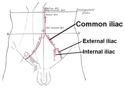 ![]() Front of abdomen, showing common iliac artery, the source of the external iliac artery | |