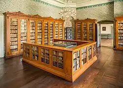 The library building consists of fifteen halls and has been outfitted with 200 bookcases made of different types of wood such as walnut, curly maple and cherry. The building was designed in the style of the Biedermeier and late classicism.[2]