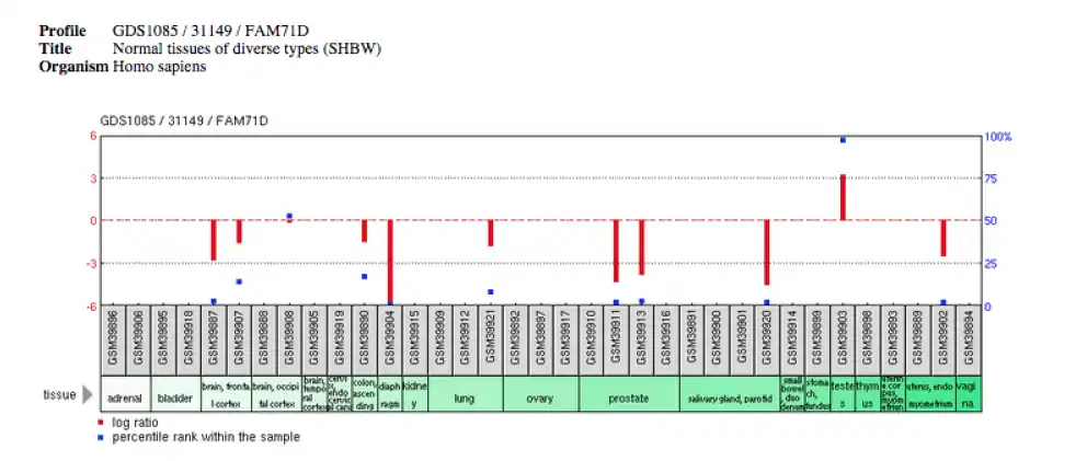FAM71D is primarily expressed in the testis of humans only expressed during the adult developmental stage.[34] GEO microarray data also supports the expression of FAM71D in humans[35]