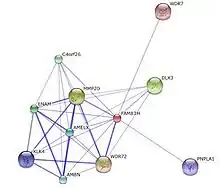 FAM83H was found to interact with WDR72 and MMP20.[19] MMP20 is responsible for the breakdown of extracellular matrix and plays a role in tissue remodeling in ameloblasts. mutations in WDR72 is thought to play a role in amelogenesis imperfecta