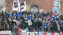 Due to predominant right-wing football supporters in Ukraine, the Arsenal supporters "Mad Rebels" lean strongly towards the anti-fascist movement and in the majority perceived as left-wing supporters.[61] Colors of the Arsenal fans coincide with those of the Ukrainian Soviet Socialist Republic's flag, while the Kyiv Arsenal factory is associated with pro-Bolshevik sentiment during the Kiev Arsenal January Uprising in 1918 following which Kyiv was overrun by the armed forces of Soviet Russia. The Arsenal supporters could also be associated with Partizan Minsk who have similar political beliefs.[61] Arsenal fans were interviewed by the BBC in 2012 for a documentary on football hooliganism called Stadiums of Hate,[62] before the UEFA Euro 2012, however their interviews were omitted from the final edit, leading some people to criticise the BBC for ignoring them in order to push their message of fascism further.[61][63]