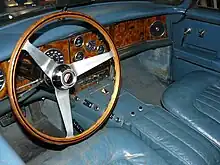 In the interior, the car features leather seats, a faux burled walnut dashboard with full instrumentation provided by Jaeger-LeCoultre, and a make up kit located in the back of the centre armrest, consisting of a chrome-handled brush and comb, and two perfume bottles, the latter albeit being supplied empty by the factory.