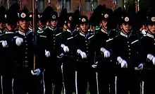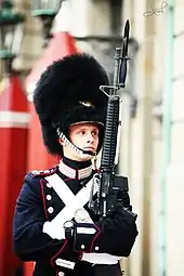 The Royal Guard (pictured) is required to be clean-shaven or bearded, depending on the style of facial hair that the monarch wears. Most operative personnel (except musicians and union representatives) are not allowed to wear beards (so as not to interfere with gas masks) unless the soldier obtains written permission to grow his beard from a flag officer; or the soldier already has a beard upon his enlistment and requests to continue growing it or maintain it at its exact length. However during "out of area" operations (outside the North Atlantic area, like in Afghanistan) soldiers are permitted full beards.