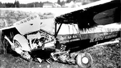 However while flying over Juneau in fog, on 28 September 1936,[14] Owen thought that he had oil-pressure problems and crash-landed near the unlit Juneau airport at night.[5][6][12] In September 1936, following the crash-landing, Owen sent a telegram to his sponsors writing: "Sea-Aska on her asska in Alaska."[15][16][17][18] The landing gear of the airplane failed and there was damage to the cowling and the propeller.[19] The aircraft remained un-repaired in Shell Simmons' hangar at Juneau airport until 1938 when it burned during a hangar fire, started accidentally by technicians working in the hangar.[14][15][18]