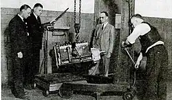 Plymocoupe engine in US Government laboratories tested by experts of the Bureau of Air Commerce. The silver housing mounted to the right of the engine block is the gear reduction unit.