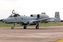 The Fairchild Republic A-10 Thunderbolt II is a single-seat, twin-turbofan, straight-wing, subsonic attack aircraft developed by Fairchild Republic for the United States Air Force (USAF). In service since 1976, it is named for the Republic P-47 Thunderbolt, but is commonly referred to as the "Warthog" or simply "Hog".[4] The A-10 was designed to provide close air support (CAS) to friendly ground troops by attacking armored vehicles, tanks, and other enemy ground forces; it is the only production-built aircraft designed solely for CAS to have served with the U.S. Air Force.[5] Its secondary mission is to direct other aircraft in attacks on ground targets, a role called forward air controller-airborne; aircraft used primarily in this role are designated OA-10.