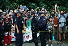 In addition to the July 2021 court action against the RCMP initiated by media outlets, Rainforest Flying Squad reported individual journalists and protestors had submitted over a dozen complaints against the RCMP by August 2021. Complaints included excessive force, confiscation of food and water, and unlawful apprehension of personal possessions, vehicles, and items providing media access, including a satellite dish.[37] The RCMP came under further criticism when a number of its officers were seen wearing thin blue line patches while on duty at the site, despite official RCMP guidelines forbidding the symbol.[38][39]