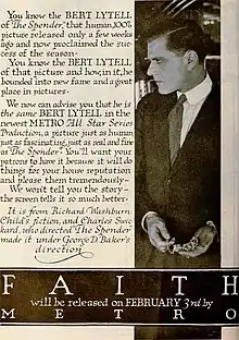 Reviews were mixed about the picture. Photoplay gave it a lukewarm review, enjoying Lytell's performance, but feeling the story was a bit unbelievable.[2] Variety did not enjoy the film, saying, "A very nice one-reeler—possibly a scant two reels—would suffice to tell the story of 'Faith' and make of it a desirable picture for Sunday school children to illustrate a lecture on the subject of virtue being its own reward."[3] Picture-Play Magazine, on the other hand, thoroughly enjoyed the film: "We don't often get such delightfully real, even, and penetrating pictures as Faith nowadays. Stories of the caliber of this one by Richard Washburn Child are not often written. But when we do get them we are ingrates indeed if we do not rise up and say 'thanks' audibly so that Metro and Bert and Mr. Child can hear. Mr. Lytell, by the way, is an actor who has that happy art of disguising the fact that he is an actor. Higher praise than this there is not."[4]