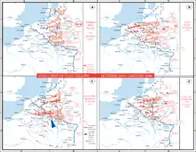 On 9 October 1939, Hitler issued Führer-Directive Number 6 (Führer-Anweisung N°6).[33] Hitler recognised the necessity of military campaigns to defeat the Western European nations, preliminary to the conquest of territory in Eastern Europe, to avoid a two-front war but these intentions were absent from Directive N°6.[36] The plan was based on the seemingly more realistic assumption that German military strength would have to be built up for several years. Only limited objectives could be envisaged and were aimed at improving Germany's ability to survive a long war in the west.[37] Hitler ordered a conquest of the Low Countries to be executed at the shortest possible notice to forestall the French and prevent Allied air power from threatening the industrial area of the Ruhr.[38] It would also provide the basis for a long-term air and sea campaign against Britain. There was no mention in the directive of a consecutive attack to conquer the whole of France, although the directive read that as much as possible of the border areas in northern France should be occupied.[36][39]