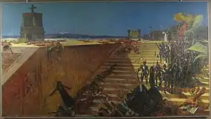 The Spanish forces and their allies advanced into the city. Despite inflicting heavy casualties, the Aztecs could not halt the Spanish advance. While the fighting in the city raged, the Aztecs cut out and ate the hearts of 70 Spanish prisoners-of-war at the altar to Huitzilopochtli. By August, many of the native inhabitants had fled Tlatelolco.[23] Cortés sent emissaries to negotiate with the Tlatelolcas to join his side, but the Tlatelolcas remained loyal to the Aztecs. Throughout the siege, the Tlaxcalans waged a merciless campaign against the Aztecs who had long oppressed them as for a hundred years the Tlaxcalans had been forced to hand over an annual quota of young men and women to be sacrificed and eaten at the Great Pyramid of Tenochtitlan, and now the Tlaxcalans saw their chance for revenge.[34] The American historian Charles Robinson wrote: "Centuries of hate and the basic viciousness of Mesoamerican warfare combined in violence that appalled Cortés himself".[34] In letter to the Holy Roman Emperor Charles V, Cortés wrote: