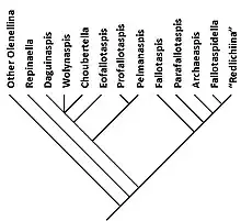 Repinaella is closest to the common ancestor with the other Olenellina. Second to split away is the Daguinaspididae-family, which comprises the closely knit group of Choubertella, Daguinaspis and Wolynaspis, with Eofallotaspis slightly further removed, and near the basis a subgroup consisting of Profallotaspis and Pelmanaspis. The monotypical family Fallotaspididae is next to branch-off. This is followed by the branch of Parafallotaspis all on its own, followed by the monotypical family Archaeaspididae. Finally Fallotaspidella is closest to the trilobites with dorsal cephalic sutures, such as Bigotina and Lemdadella.[1]