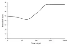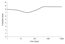 ![]() The protection factor provided by 10 cm of concrete shielding where the source is the idealised Chernobyl fallout.[39] |