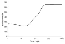 ![]() The protection factor provided by 30 cm of concrete shielding where the source is the idealised Chernobyl fallout.[39] |