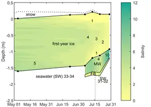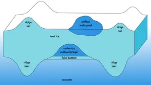 During Arctic summer, snow and ice melt results in the accumulation of low-salinity meltwater. Most of this meltwater is transferred to the ocean, while some of it migrates to the surface melt ponds, the sea ice matrix, and under-ice meltwater layers. False bottoms form due to a substantial difference in freezing temperatures of water with different salinities. Their formation in summer was first documented by Fridtjof Nansen in 1897.[9] During MOSAiC expedition, false bottoms occurred in areas of thin and ponded sea ice encircled by thicker sea ice ridges and were formed at the same time when surface melt ponds drained.[10] False bottoms are formed at the upper part of the interface of meltwater and seawater. The ice crystals initially grow downwards towards seawater, and further grow horizontally until a formation of a horizontal ice layer. After the formation of this horizontal layer, false bottoms constantly migrate upwards due to conductive heat flux, supported by the temperature difference between meltwater and seawater, and the rate of such migration is mostly defined by its thickness.[11] The growth and melt of false bottoms are controlled by the physical parameters of the ocean.[12] False bottoms are often observed in areas of thin ice covered by surface melt ponds and encircled by thicker pressure ridges, with ridge draft limiting the depth of under-ice meltwater layers.[7]