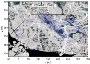 False bottoms have been observed under drifting Arctic sea ice, under land-fast ice in Greenland, and at Ward Hunt Ice Shelf. Being located under ice, false bottoms are not easy to investigate, and the current observations are quite variable. For example, the areal coverage of false bottoms was 50% at the drifting station Charlie in 1959,[3] 15% during SHEBA expedition in 1998[4] and 20% during MOSAiC expedition in 2020.[1] Both physical modelling[5][6] and in situ observations[7] suggest that false bottoms may decrease sea ice melt up to 8%. The salinity and temperature of under-ice meltwater and false bottoms are controlled by both ice melt and desalination. The salinity of false bottoms was 1.0 during the ARCTIC 91 expedition,[8] 0.4 during SHEBA and 2.3 during MOSAiC. The average thickness of false bottoms was 20 cm during the ARCTIC 91 expedition, 15 cm during SHEBA, and 8 cm during MOSAiC. The presence of false bottoms can increase the rates of sea ice desalination.[8]