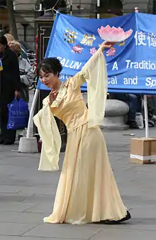 In contrast to marches, which focus on bringing attention to the persecution in China, celebratory Falun Gong parades usually incorporate traditional-style Chinese dances, costumes, song, exercise demonstrations, drumming, floats, and banners.[52] Practitioners regularly hold parades or public exhibitions of Chinese cultural performances to coincide with May 13, the anniversary of the practice's first public teaching in China. Practitioners also utilize various parade venues around the world to publicize their group and its message.[28]