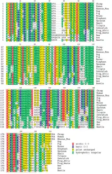 As shown in the alignment, the protein is highly conserved chemically, although the exact sequence varies. There are also several regions of high conservation (highlighted by the red boxes). The degree of conservation follows the expected evolutionary pattern. The graph demonstrates this by plotting each species protein similarity to the human protein vs. the time since the species shared a common ancestor. The unrooted phylogenetic tree also demonstrates this relationship.