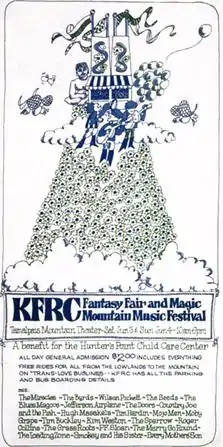 The KFRC Fantasy Fair and Magic Mountain Music Festival was an event held June 10 and 11, 1967, at the 4,000-seat Sidney B. Cushing Memorial Amphitheatre high on the south face of Mount Tamalpais in Marin County, California. Although 20,000 tickets were reported to have been sold for the event, as many as 40,000 people may have actually attended the two-day concert, which was the first of a series of San Francisco–area cultural events known as the Summer of Love.[1] The Fantasy Fair was influenced by the popular Renaissance Pleasure Faire and became a prototype for large scale multi-act outdoor rock music events now known as rock festivals.[2][3][4]
