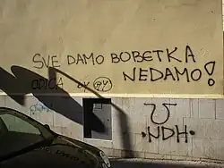 Graffiti on a wall in Croatia, which says "We'll give everything, but won't give Bobetko!", as well as the logo of the Ustaše and the acronym for the Independent State of Croatia. (see text)