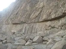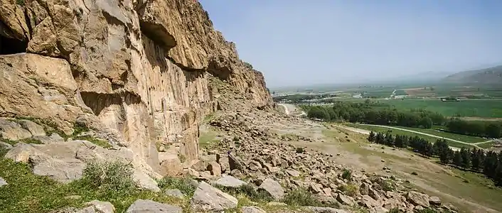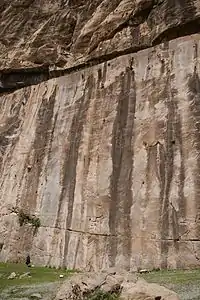 The Farhād Tarāsh (Persian: فرهاد تراش), or Tarāsh-e Farhād[1] is a long smoothed rock surface on Mount Behistun in western Iran. Located near the famous Behistun Inscription, its height is around 30 meters and its width is around 200 meters.[1] The retaining wall in front of it is c. 150 meters.[1] The work is registered as a national heritage in Iran, and it's the biggest work of such kind in Iran.[1] The Farhād Tarāsh has sparked interest from medieval geographers including Istakhri (died 957) and Yaqut al-Hamawi (died 1229) to travelers and archaeologists in modern times.[1]