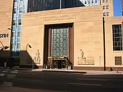 The 1942 Farmers and Mechanics Savings Bank building in downtown Minneapolis, Minnesota, United States, is a former bank building that is now the home of a Westin Hotel. The building is an example of the Streamline Moderne phase of the Art Deco movement and is notable for its bold relief sculptures of a farmer and a mechanic framing the main entrance. The sculptures were designed by Warren T. Mosman, who headed the sculpture department at the Minneapolis Institute of Arts.[2] The structure was listed on the National Register of Historic Places in 2006.