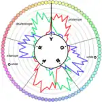 ![]() The Munsell color system, showing: a circle of hues at value 5 chroma 6; the neutral values from 0 to 10; and the chromas of purple-blue (5PB) at value 5. | |