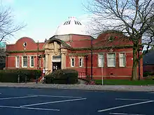 Farnworth's Carnegie Library on Market Street is one of the many Carnegie libraries in Europe established by the industrialist and philanthropist Andrew Carnegie. The library was built in 1911 and is constructed of red brick with ashlar sandstone dressings, and flat roofed areas surrounding a central dome. It was designated as a Grade II listed building on 29 September 1999 and celebrated its centenary on 11 April 2011.[24]