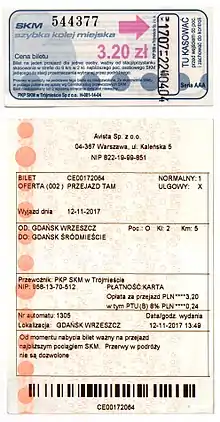 The layout of the ticket has changed over time. At first, tickets were identical on all local lines, and were small cardboard rectangles, often with a hole pierced in the middle. Tickets then became orange, with a white stripe on one end for stamping information about the station and time of validation. The SKM then moved to light blue tickets, also with a white stripe which were only valid on its lines. Originally, this new layout had a list of stops printed on the reverse. Recently, this has been replaced by advertisements or information about the possibility of advertising. There are also blank tickets, sold by train conductors to sell tickets at stops where no ticket office is available. These have a list of stops with boxes to note start and destination of the journey, type of discount (if any) and number of tickets. An extra fee for sale on the train can also be noted on these tickets, for instance, if a passenger boards at a stop where he could buy a ticket normally.
