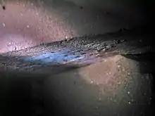 Picture of egg mass adhering to underside of a "rock cave" in a home aquarium (130 gal)