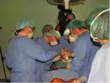 At Dalladaku's initiative, in May 2003 a team of medical professionals from Germany arrived in Kosovo with the mission to perform the first two bypass open-heart surgeries there. In addition to the free of charge diagnostics of the two patients at the Cardiology Clinic of the Medical Faculty in Tirana, Albania, a few days before surgery, Dalladaku also arranged the transportation of the necessary medical equipment from Germany to Kosovo, including heart lung machines and intra-aortic balloon pumps. After four days of traveling and numerous bureaucratic complications on the way, the technical equipment which was being accompanied by Dalladaku's colleague, Michael Rothe, arrived in Prishtina on May 23.[4] The next day, on May 24, two patients aged 67 and 51 underwent heart surgery which was carried out at the newly renovated operation room of the Clinic of Gynecology and Obstetrics of the University Clinical Center of Kosovo. Surgery was provided free of charge, as all costs were borne by the Herzzentrum Lahr/Schwarzwald clinic, and FD Company, Dalladaku's family business at that time. Although no complications occurred, the German KFOR troops stationed in Kosovo were ready to provide, if needed, transportation from Kosovo to Germany for the two patients.