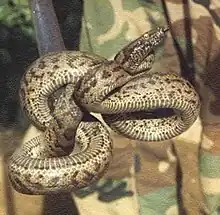 Puerto Rico's herpetofauna consists of 25 amphibian species and 61 reptile species. The majority of West Indian terrestrial reptile clade is believed to have arrived by flotsam dispersion from South America. Little evidence exists to support the alternative hypothesis of proto-Antillean vicariance.[27] Other terrestrial herpetofauna are believed to have arrived to the West Indies (and Puerto Rico) by the same method and subsequently undergone vicarization by banks or islands.[28] As a result, Puerto Rico, and the Caribbean in general, has one of the highest percentages of endemism among amphibians and reptiles in the world. Amphibian species in Puerto Rico belong to four families: Bufonidae (2 species), Hylidae (3), Leptodactylidae (18) and Ranidae (2). Reptiles include turtles (freshwater and marine), lizards, worm lizards, snakes and a caiman.