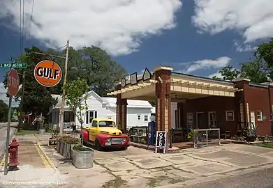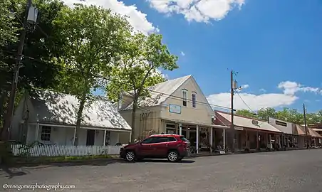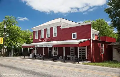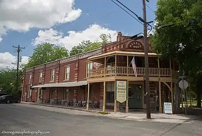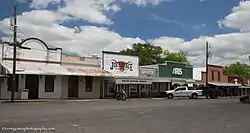 A former precinct courthouse, sits in the town square with extra wide 100-foot (30 m) curbed streets on its borders as specified in the original 1850 plat. Bounded by Main, Washington, Live Oak and Fayette streets the town square is the focus of commercial development. The remainder of the town is primarily residential. Typical commercial construction is wood frame block buildings many featuring false front parapets and awnings. Residential construction is typically modest single family homes on generous lots.[2]