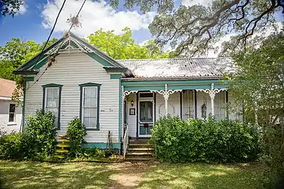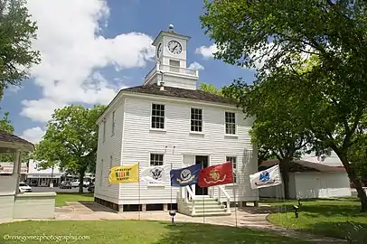 The Fayette County Precinct No. 2 Courthouse, built in 1880 is wood-frame construction with horizontal wood siding and has a simple two story square plan. The south elevation is the facade with simple wood stairs and solid wood panel double doors. Windows are symmetrically placed with three bays on the north and south, and two on the east and west.[2] Construction of the Victorian style building was funded by US$600 (equivalent to $18,194 in 2022) in contributions from the citizens of Fayetteville and an additional US$200 in tax funds from the County Commissioners' Court. Funding for painting the building was raised by holding a ball. A calaboose (holding jail) with two cells was finished in 1887.[3] A clock tower, financed by a ladies club, was added in 1934 in the center of the hipped roof.[2][3] It is no longer used as a courthouse. Precinct courthouses were quite rare in early Texas and this one was listed as an RTHL in 1997.[2] The other government building, the post office, is not considered historical, dating from the late 1960s.[2]