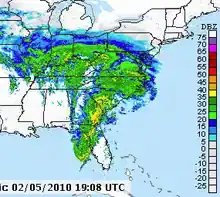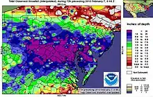 The February 5–6, 2010 North American blizzard, commonly referred to as Snowmageddon,[1] was a blizzard that had major and widespread impact in the Northeastern United States. The storm's center tracked from Baja California Sur on February 2, 2010, to the east coast on February 6, 2010, before heading east out into the Atlantic. Effects were felt to the north and west of this track in northern Mexico, California, and the southwestern, midwestern, southeastern, and most notably Mid-Atlantic states. Severe weather, including extensive flooding and landslides in Mexico, and historic snowfall totals in every one of the Mid-Atlantic states, brought deaths to Mexico, New Mexico, Virginia, Pennsylvania, and Maryland.[2]