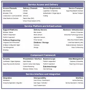 - Service Categories : classify lower levels of technologies and standards with respect to the business or technology function they serve. In turn, each Service Category comprises one or more Service Standards. (Bold-face groupings)
