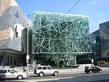 Federation Square (marketed and colloquially known as Fed Square[1]) is a venue for arts, culture and public events on the edge of the Melbourne central business district. It covers an area of 3.2 ha (7.9 acres) at the intersection of Flinders and Swanston Streets built above busy railway lines and across the road from Flinders Street station. It incorporates major cultural institutions such as the Ian Potter Centre, Australian Centre for the Moving Image (ACMI) and the Koorie Heritage Trust as well as cafes and bars in a series of buildings centred around a large paved square, and a glass walled atrium.