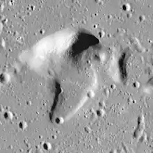 This feature is slightly elongated and oddly shaped, with a ridge on the northern side. This ridge is about as large around the base as Federov crater, and rises about 0.8 km above the surrounding lunar mare.