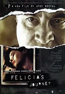 Felicia's Journey is a 1999 British-Canadian psychological thriller film written and directed by Atom Egoyan and starring Elaine Cassidy and Bob Hoskins.[3] It is based on the prize-winning 1994 novel of the same name by William Trevor. It was entered into the 1999 Cannes Film Festival and won four Genie Awards, including Best Adapted Screenplay.