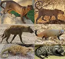 Clockwise from top-left: Fossa (family Eupleridae), Leopard (family Felidae), Stripe-necked mongoose (family Herpestidae), African civet (family Viverridae), Two-spotted palm civet (family Nandiniidae), Spotted hyena (family Hyaenidae)