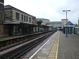 The southern platform (2, westbound, or 'Down') hosts the bulk of the original station house.[2] Two near-adjoining entrances, a small shop, automatic ticket machines and covered seating serve the platform. The mid-19th century former house is at the northern extremity of Feltham's principal architectural conservation area, taking in Hanworth Road, lined primarily with detached late Victorian houses.[2]