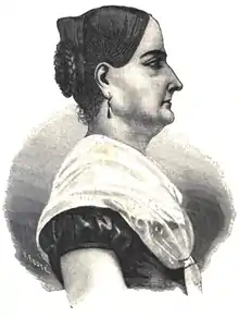 Some women distinguished themselves during the Mexican War of Independence (1810-1821),[55] and also were employed as spies, provocateurs, and seductresses. Newspapers in 1812 harangued women to take part in the independence effort as they owed their countrymen a debt for submitting to conquest and subordinating Mexico to Spanish rule.[56] The most prominent female hero of the independence movement is Josefa Ortiz de Domínguez, known in Mexican history as La Corregidora. Her remains were moved to the Monument to Independence in Mexico City, there are statues of her in her honor, and her face has appeared on Mexican currency. Other distinguished women of the era are Gertrudis Bocanegra, María Luisa Martínez de García Rojas, Manuela Medina, Rita Pérez de Moreno, Maria Fermina Rivera, María Ignacia Rodríguez de Velasco y Osorio Barba, known as the Güera Rodríguez; and Leona Vicario.