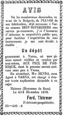Commercial notice about establishing a Ferd. Thürmer Piano store in Varna, Principality of Bulgaria, 1893