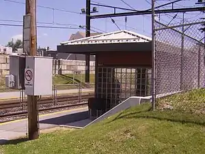Fernwood–Yeadon station (originally Fernwood station) is a SEPTA Regional Rail station in Yeadon, Pennsylvania. It serves the Media/Wawa Line and is located at Church Lane (US 13) and Penn Boulevard. The station saw 113 boardings and 132 alightings on an average weekday.[2] The station originally had a wooden pedestrian bridge and a grade crossing.