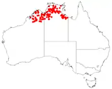 In the Northern Territory it is found in the bioregions: Arnhem Coast, Arnhem Plateau, Central Arnhem, Central Kimberley, Daly Basin, Darwin Coastal, Gulf Coastal, Gulf Fall and Uplands, Northern Kimberley, Ord Victoria Plain, Pine Creek, Sturt Plateau, and Victoria Bonaparte.[1] In Western Australia it is found in the bioregions: Central Kimberley, Dampierland, Northern Kimberley, Ord Victoria Plain, and Victoria Bonaparte.[2]