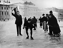 Prior to 1872 Admiralteyskaya Square had also been used as a venue for festivals, but the laying out of the Alexander Garden meant that there was no space for the booths, and the Field of Mars became the sole venue in the city.[3][4] As well as entertainments, sports competitions were also held, with activities such as climbing a greasy pole, and walking on a spinning log.[2] In 1867, concerned about the high levels of drunkenness in the city, authorities placed restrictions on the sale of alcohol during public holidays. In August 1867 some 100,000 people gathered on the Field of Mars, without a single arrest for drunkness.[9] In 1892 a 12-year-old received a set of china for winning the spinning log competition. Festivals were held on the occasions of the parades of the Preobrazhensky and Semyonovsky Regiments from 1897, until 1907 when festivals on the Field of Mars were banned.[3] It was around this time that a tower was built on the field to house a telescope. A proposal was made to construct a bicycle track on the Field of Mars, but it ultimately failed to gain sufficient funding. Sporting events continued to be held on the field during the early twentieth century. It hosted the world championship in speed skating in winter 1903, and in 1913 the first inter-city hockey match was held here. The Saint Petersburg team "Sport" were beaten 2:6 by an English club.[3] A reinforced concrete skating rink was built that year to a design by Yevgeny-Karl Schröter, though the entrance fee was comparatively expensive at 55 kopecks in the afternoon, 1 ruble 10 kopecks in the evening.[3] The building was considered to detract from the existing architectural ensemble, and was dismantled shortly afterwards.[4]