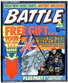 ![]() "Fight for the Falklands" on the cover of the 18 September 1982 edition of Battle, art by Jim Watson. | |