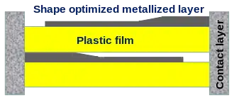 The surge current rating of film capacitors can be enhanced by various internal configurations. Because metallization is the cheapest way of producing electrodes, optimizing the shape of the electrodes is one way to minimize the internal resistance and to increase the current-carrying capacity. A slightly thicker metallization layer at the schoopage contact sides of the electrodes results in a lower overall contact resistance and increased surge current handling, without losing the self-healing properties throughout the remainder of the metallization.[16]