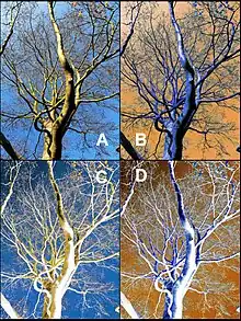 A negative image can allow a different perception of an everyday scene perhaps highlighting spatial relationships and details that are less obvious in the positive image. For example, the photographer Andrew Prokos has produced an award-winning series of photographs under the “inverted” banner.[10] The advent of digital image processing has expanded the possibilities. In a physical photograph the colour and luminance can only be inverted in tandem, but digital processing allows each to be inverted separately. If the hue of an image is rotated by 180 degrees, then the colour of the image is inverted but not its luminance. The negative of such an image has the luminance inverted but not the colour. Whereas a physical image can be either ‘inverted’ or ‘not inverted’, a digital image can exhibit a partial degree of colour inversion[11] in so far as the hue can be altered by plus or minus some number of degrees which is greater than zero degrees but less than 180 degrees.