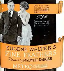 Fine Feathers is a 1921 American silent drama film directed by Fred Sittenham and starring Eugene Pallette, Claire Whitney, Thomas W. Ross, Warburton Gamble and June Elvidge, produced and distributed by Metro Pictures Corporation. The library of Congress shows a release date of June 20, 1921[1] but there is evidence that Fine Feathers was being screened on June 18 at the Rose Theater[2] in Santa Rosa California and as early as June 17 at the Star Theater in Monterey California.[3] This production is the second movie adaptation of Eugene Walter's 1912 play of the same name. Three complete 35 mm copies were donated by M.G.M. to the U.S. Archive.[1] A nitrate picture negative, an acetate positive print and an acetate fine grain master, all kept at the Eastman Museum in Rochester, NY.[4]